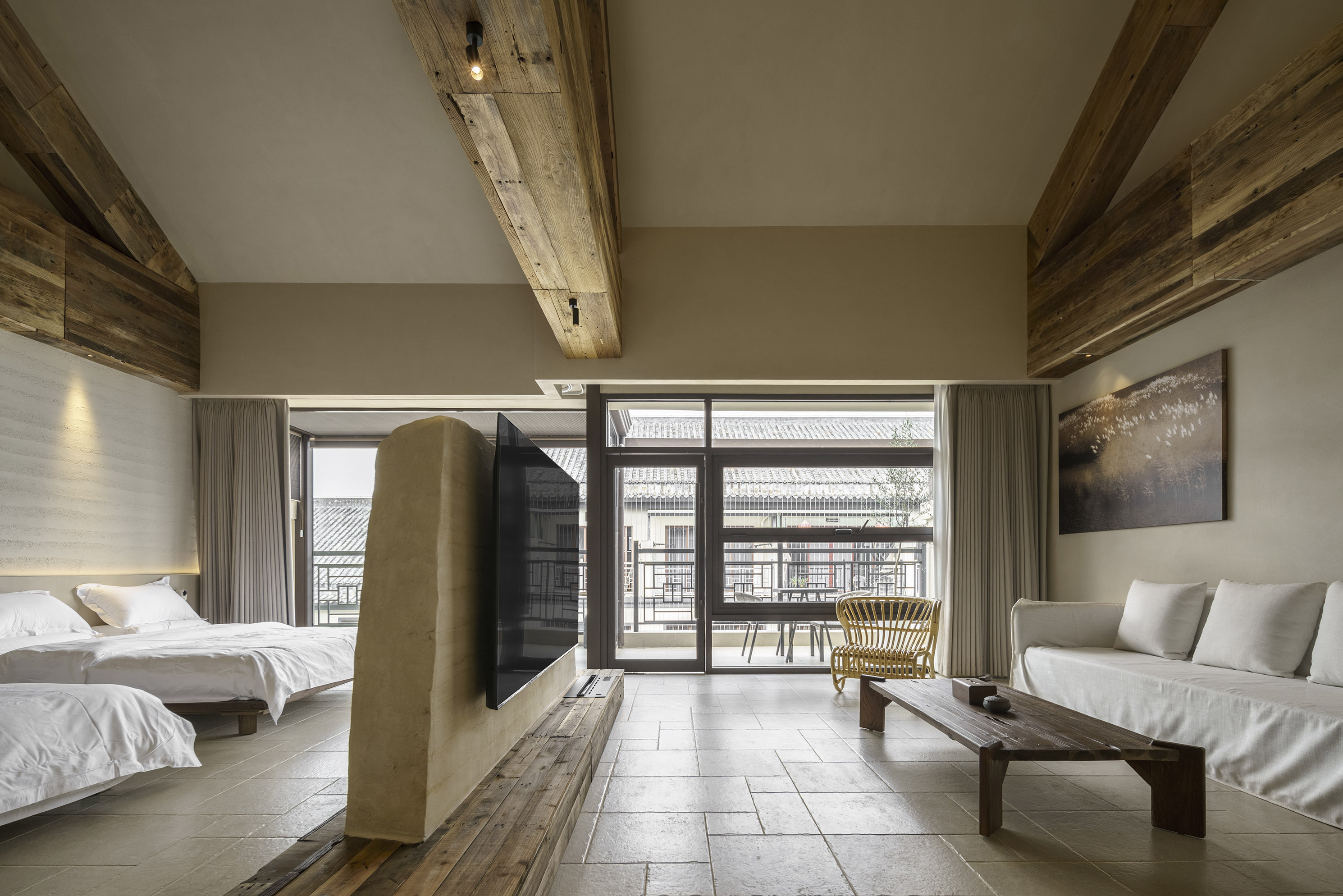 The public spaces are built with simple, natural materials like brick, stone, and wood, giving the place an elegant, understated, and poetic atmosphere. The furniture is primarily made from wood and bamboo weaving, chosen for their natural beauty that adds an invaluable touch of ancient charm to the space.